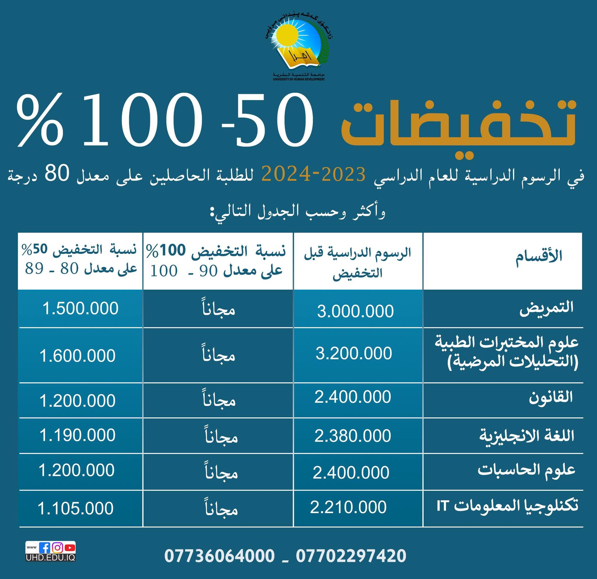 The University of Human Development announces full scholarships and reduction of tuition fees for all its departments for the academic year 2023-2024, as follows: