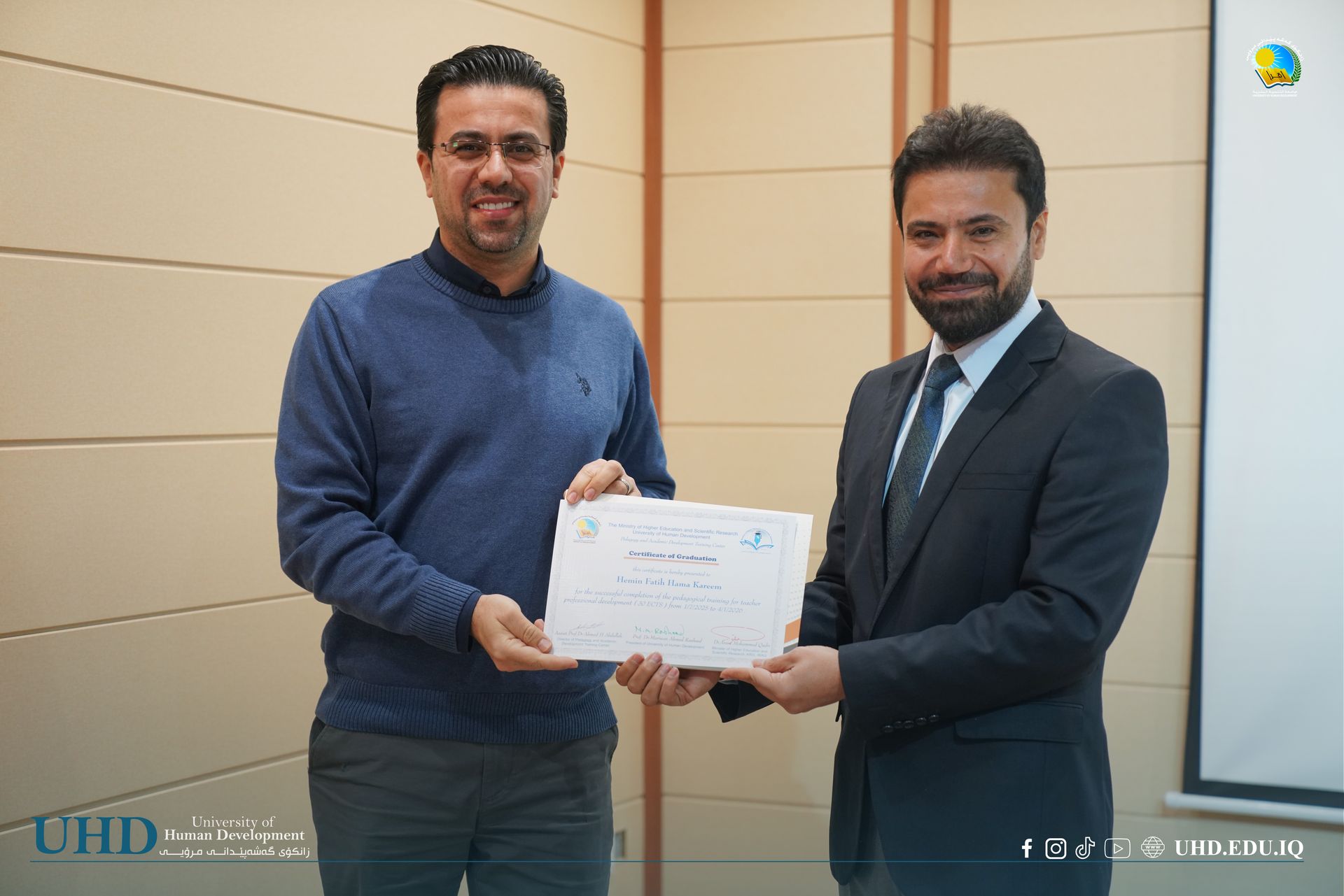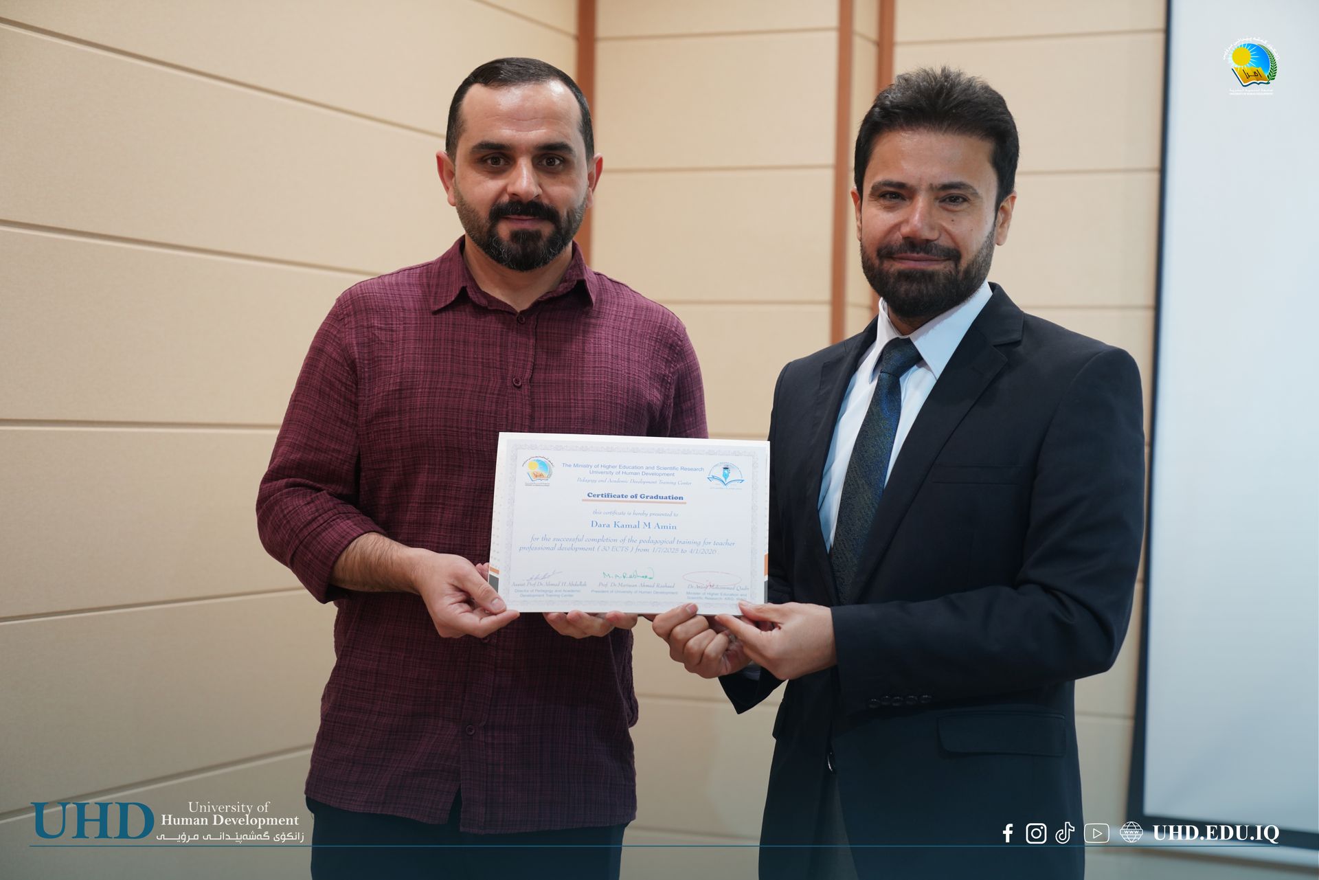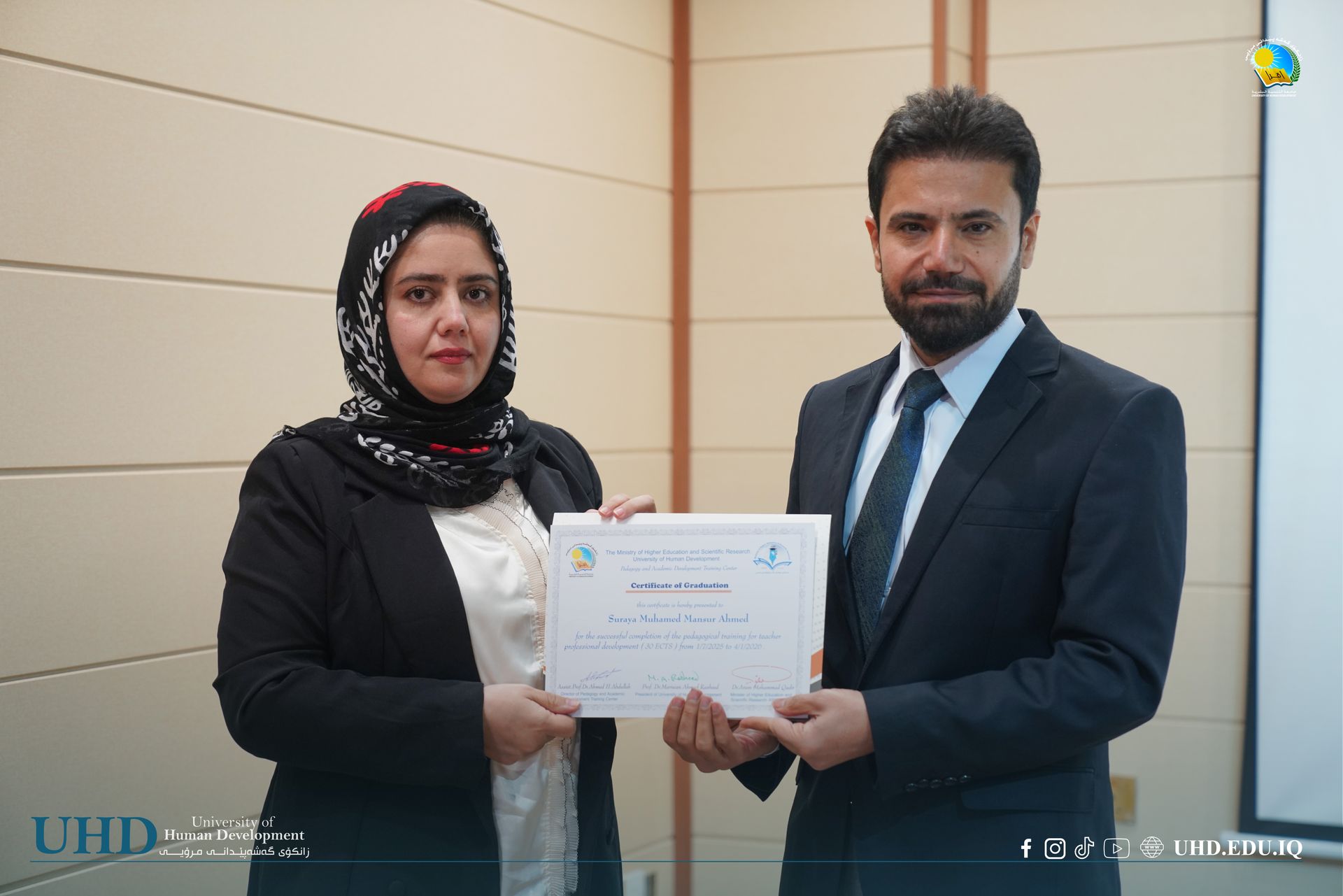 Asst Prof. Dr Ahmed Omar Bali, the Director of the Pedagogy and Academic Development Training Centre, expressed his satisfaction with the course and congratulated the participants for successfully completing it. He stated that they would now hold licenses to teach at universities, institutes, and other higher education institutions. He pointed out that UHD's Pedagogical Training Centre was the first of its kind to be opened in the Sulaymaniyah Governorate, where holders of Master's and PhD degrees can qualify for working as lecturers at universities and institutes.