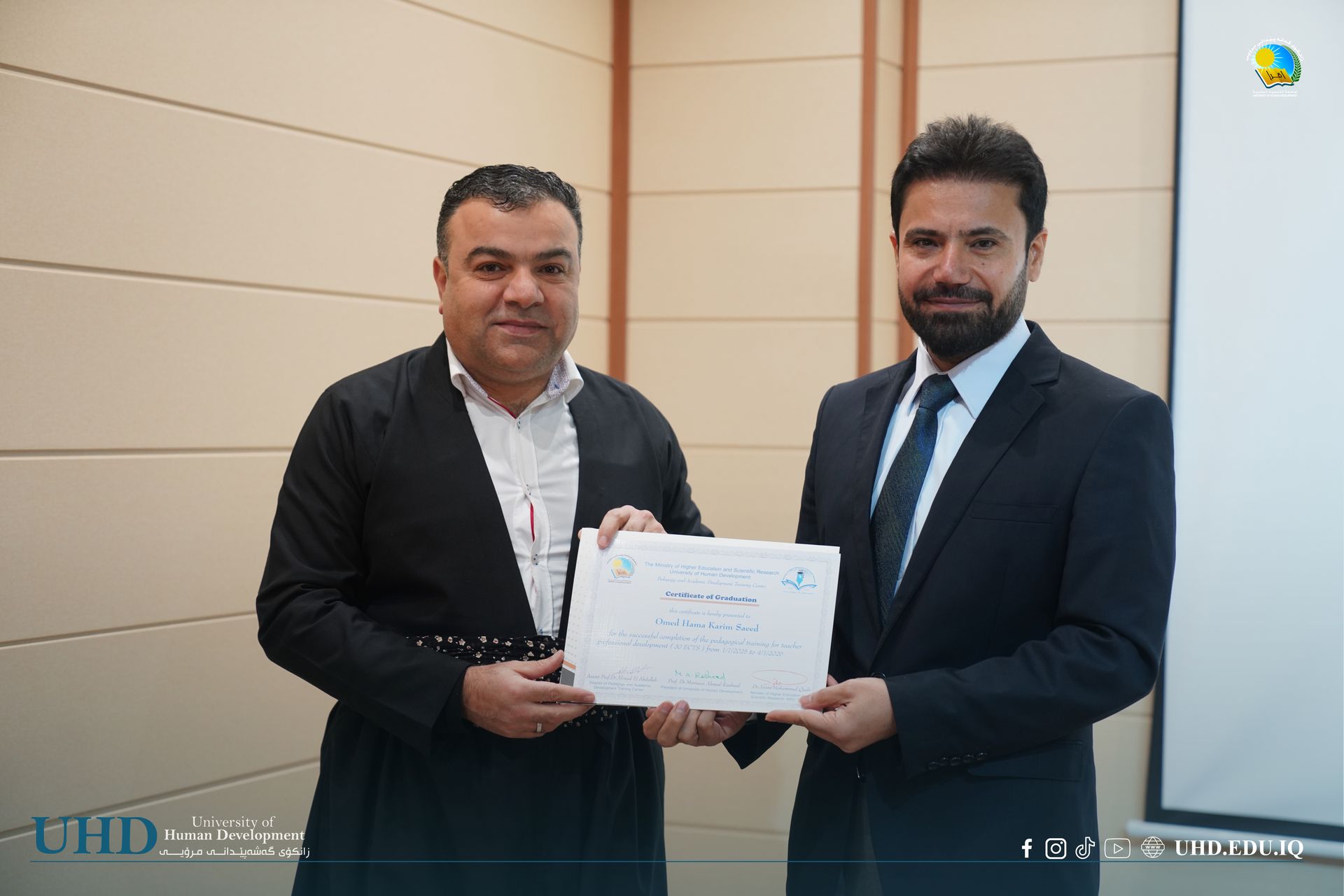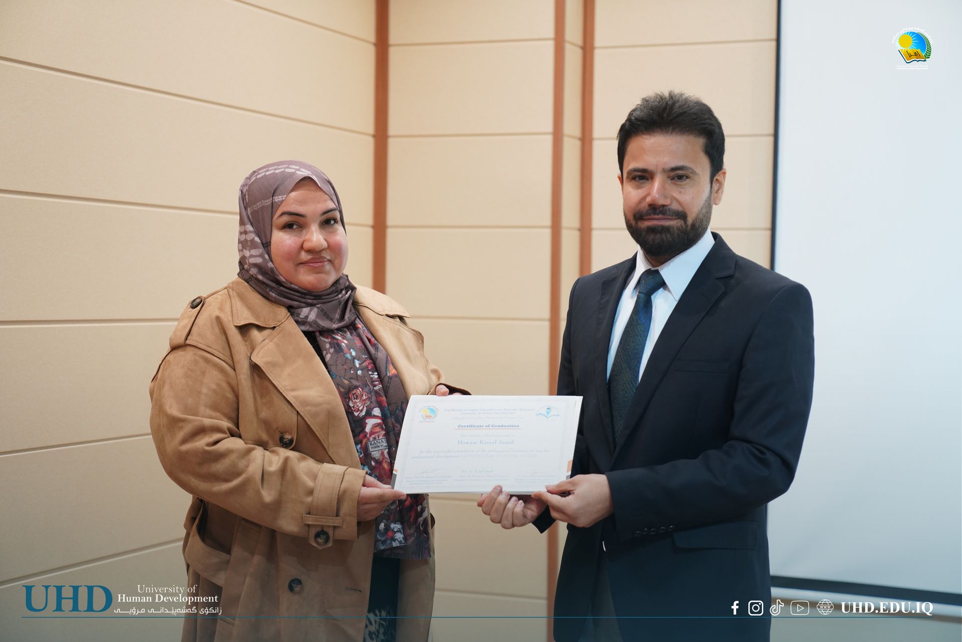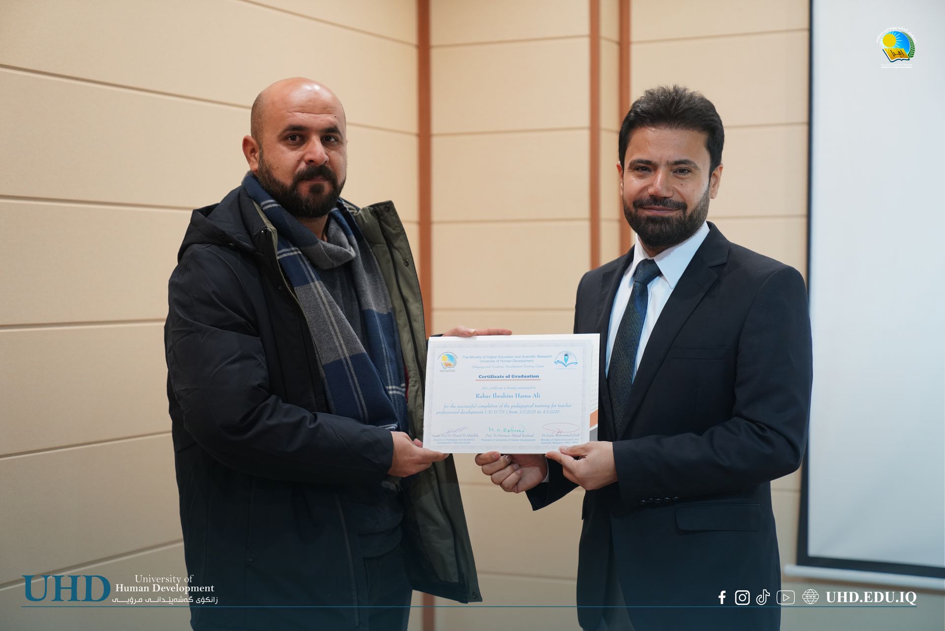 Asst Prof. Dr Ahmed Omar Bali, the Director of the Pedagogy and Academic Development Training Centre, expressed his satisfaction with the course and congratulated the participants for successfully completing it. He stated that they would now hold licenses to teach at universities, institutes, and other higher education institutions. He pointed out that UHD's Pedagogical Training Centre was the first of its kind to be opened in the Sulaymaniyah Governorate, where holders of Master's and PhD degrees can qualify for working as lecturers at universities and institutes.